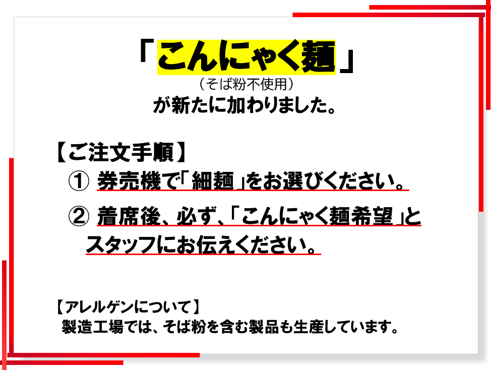【辛麵NAKANONYA】ご要望にお応えし「こんにゃく麵」が新たに加わりました。 【カテゴリー】 商品情報 未分類 2025年12月23日 ★こんにゃく麵、特製中華麺から、どちらかお好きな麺をお選びいただけるようになりました。★ 【12月23日(火)~】 お客様のご要望にお応えし、特製中華麵に加えて、「こんにゃく麵」を提供いたします。! 当面の間、お手間をおかけしますが、 こんにゃく麵を希望される方は、 ①券売機にて「細麺」をお選びいただくとともに、 ②着席後に、必ずスタッフに「こんにゃく麵 希望」とお申しつけくださいませ。 【前の投稿を見る】年末年始営業のお知らせ(風来軒(直営店)・辛麺NAKANOYA) 【次の投稿を見る】