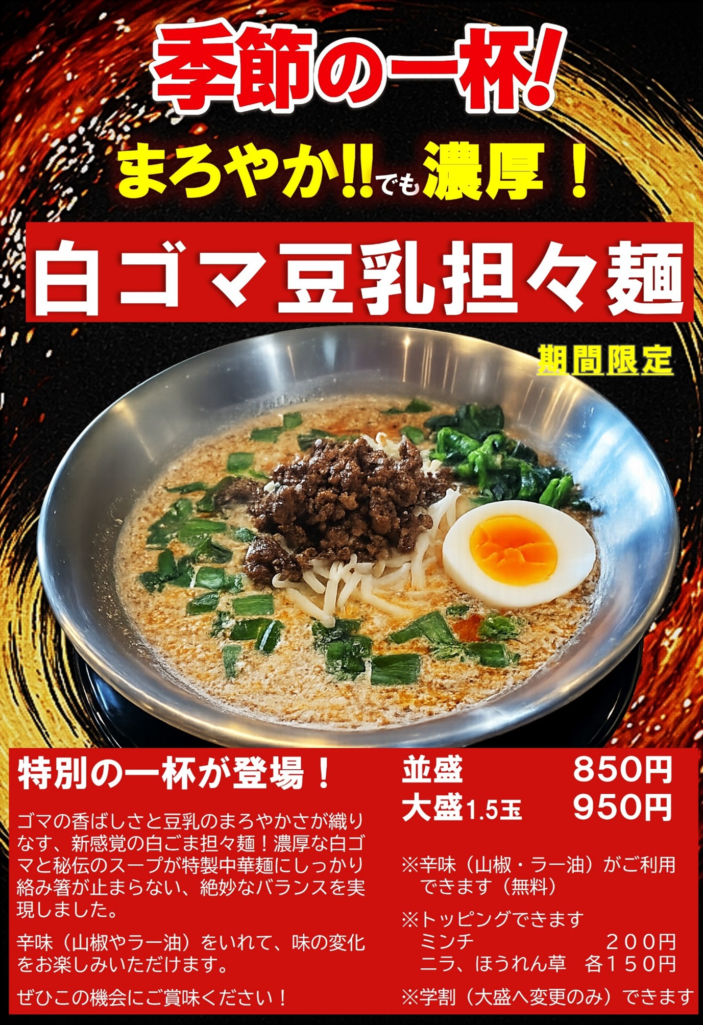 ★季節メニュー「白ごま豆乳担々麺」を提供しています。★