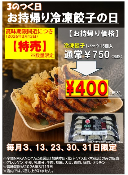 商品入替につき、2/10(火)から「お持帰り冷凍餃子」を直営店舗にて大特価で販売いたします。 【カテゴリー】 商品情報 2026年02月10日 ◇1パック15個入通常¥750(税込)のところ、¥400(税込)で販売いたします。 ◇在庫が無くなり次第販売を終了いたします。 ◇辛麺NAKANOYA及び直営店(加納本店・北バイパス店・木花店)でのみ購入いただけます。 ◇賞味期限が2026年3月13日までの商品です。 【前の投稿を見る】【辛麵NAKANONYA】季節メニュー「白ごま豆乳担々麺」始めました。 濃厚な白ごまと豆乳をベースにした秘伝のタレが決め手! 【次の投稿を見る】